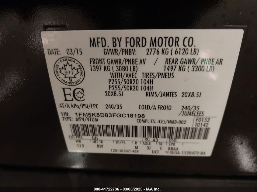 Color BlackCylinders 6Drive Full driveVIN 1FM5K8D83FG******State Run & Drive VerifiedDamage Front or back AutoRIA