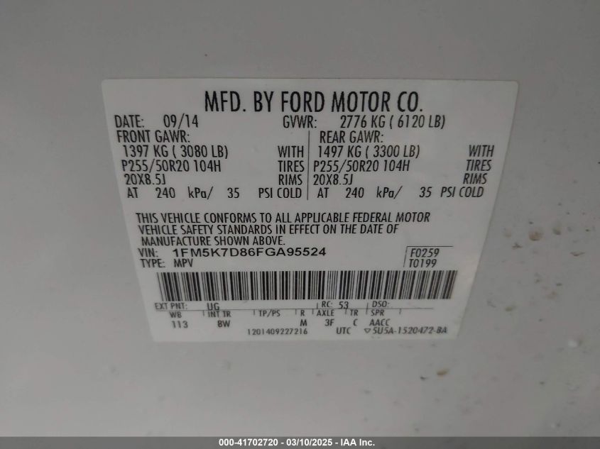 Color WhiteCylinders 6Drive Front wheel driveVIN 1FM5K7D86FG******State Run & Drive VerifiedDamage Right side AutoRIA