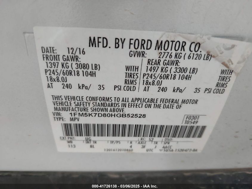 Color WhiteCylinders 6Drive Front wheel driveVIN 1FM5K7D80HG******State Run & Drive VerifiedDamage Front or back AutoRIA