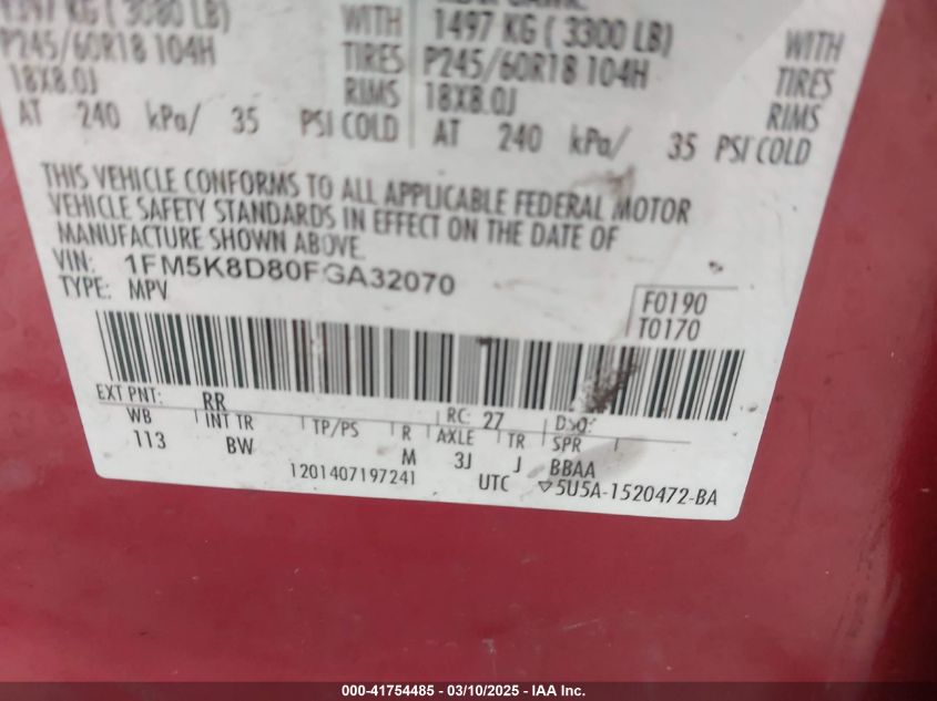 Color RedCylinders 6Drive Full driveVIN 1FM5K8D80FG******State Run & Drive VerifiedDamage Left side AutoRIA