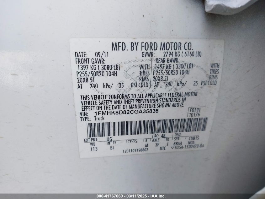 Color WhiteCylinders 6Drive Full driveVIN 1FMHK8D82CG******State Run & Drive VerifiedDamage Front or backAuction date 2025-03-20 AutoRIA