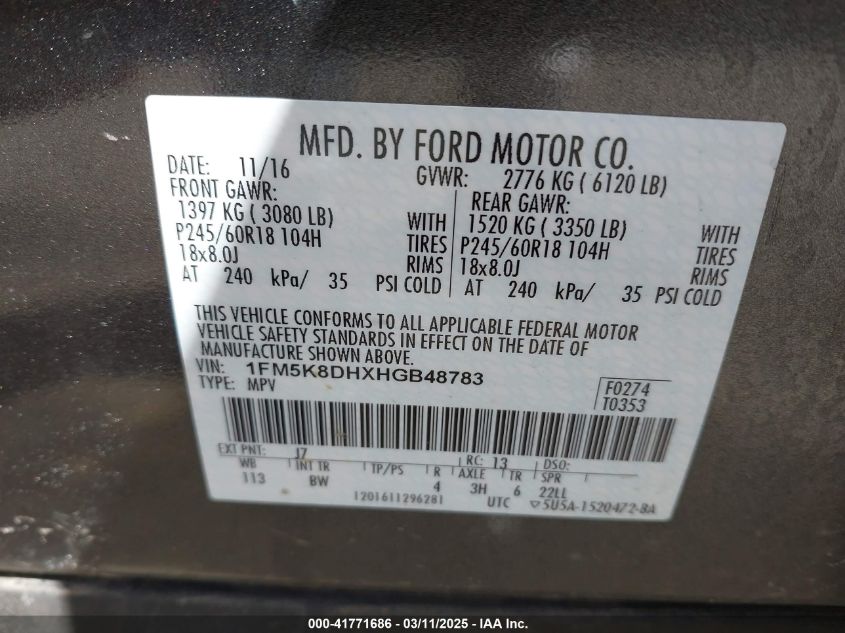 Color GrayCylinders 4Drive Full driveVIN 1FM5K8DHXHG******State Run & Drive VerifiedDamage Front or back AutoRIA