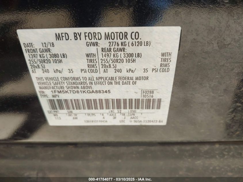 Color BlackCylinders 6Drive Front wheel driveVIN 1FM5K7D81KG******State Run & Drive VerifiedDamage Front or back AutoRIA