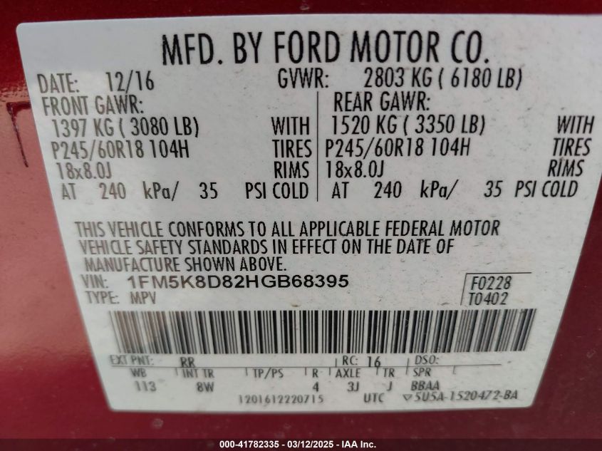 Color RedCylinders 6Drive Full driveVIN 1FM5K8D82HG******State Run & Drive VerifiedDamage Front or back AutoRIA