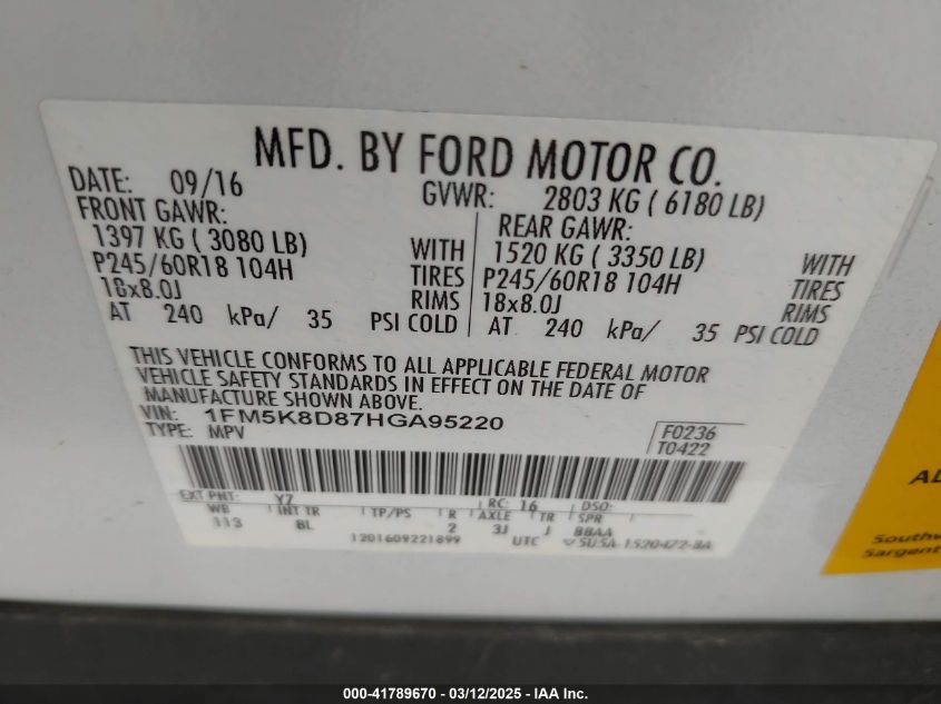 Color WhiteCylinders 6Drive Full driveVIN 1FM5K8D87HG******State Run & Drive VerifiedDamage Front or back AutoRIA