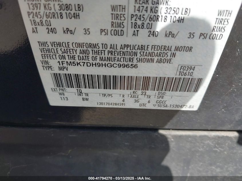 Color GrayCylinders 4Drive Front wheel driveVIN 1FM5K7DH9HG******State Run & Drive VerifiedDamage Right sideAuction date 2025-03-25 AutoRIA