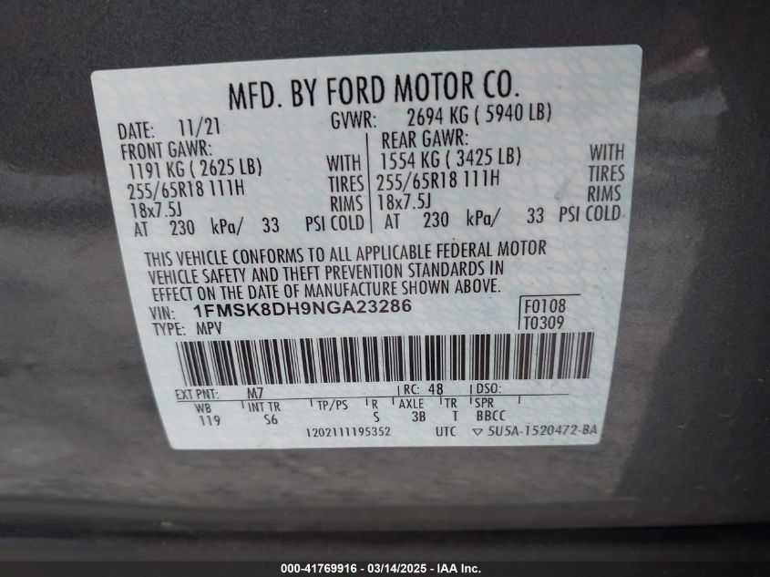 Color GrayCylinders 4Drive Full driveVIN 1FMSK8DH9NG******State Run & Drive VerifiedDamage Front and back AutoRIA