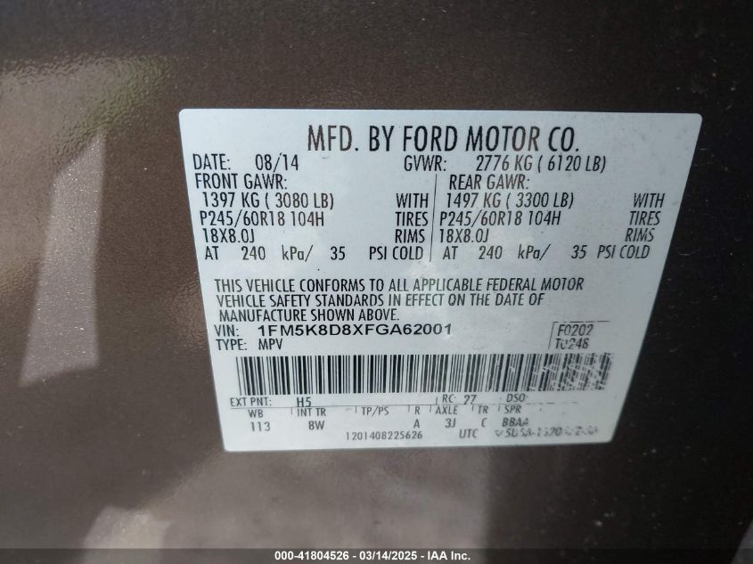 Color GrayCylinders 6Drive Full driveVIN 1FM5K8D8XFG******State Run & Drive VerifiedDamage Front or back AutoRIA