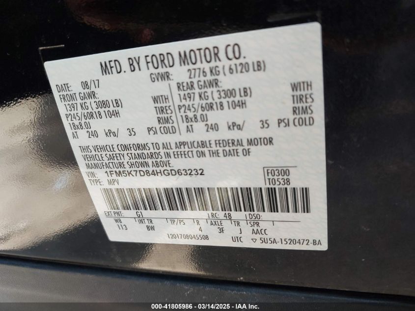 Color BlackCylinders 6Drive Front wheel driveVIN 1FM5K7D84HG******State Run & Drive VerifiedDamage Back AutoRIA
