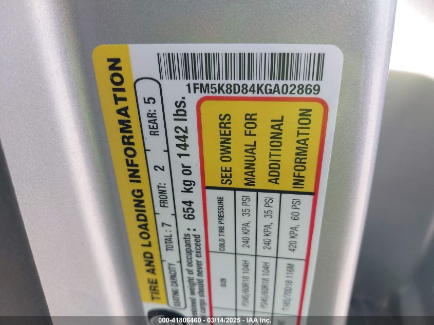 Color SilverCylinders 6Drive Full driveVIN 1FM5K8D84KG******State Run & Drive VerifiedDamage Front or back AutoRIA
