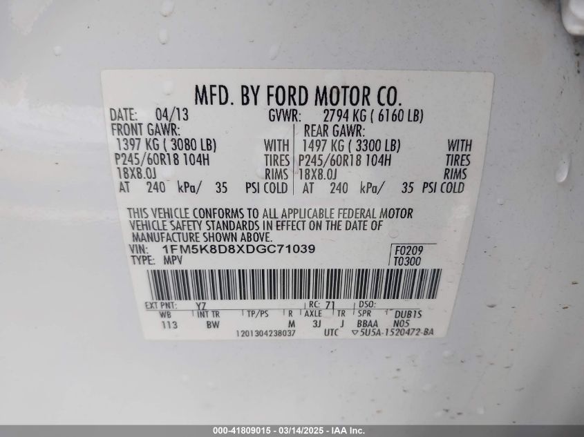 Color WhiteCylinders 6Drive Full driveVIN 1FM5K8D8XDG******State Run & Drive VerifiedDamage All over the car AutoRIA