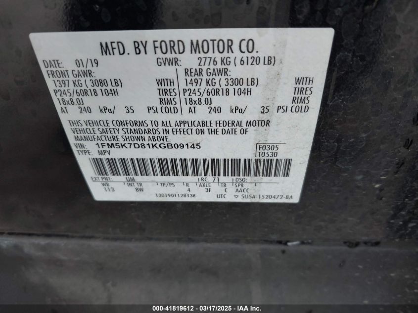 Color BlackCylinders 6Drive Front wheel driveVIN 1FM5K7D81KG******State Run & Drive VerifiedDamage Right side AutoRIA