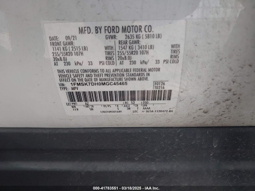 Color WhiteCylinders 4Drive UnknownVIN 1FMSK7DH0MG******State Run & Drive VerifiedDamage Right side AutoRIA