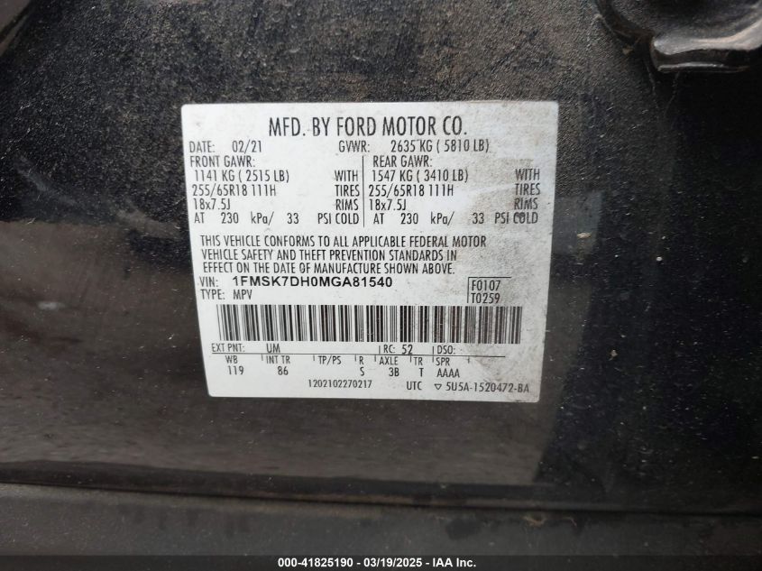 Color BlackCylinders 4Drive UnknownVIN 1FMSK7DH0MG******State Run & Drive VerifiedDamage Front left AutoRIA