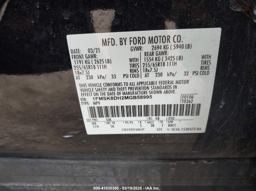 Color BlackCylinders 4Drive Full driveVIN 1FMSK8DH2MG******State Run & Drive VerifiedDamage Front or back AutoRIA