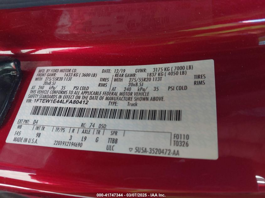 2020 FORD F-150 2020 Gasoline, 3.5, Full drive, VIN - 1FTEW1E44LF****** from the USA
