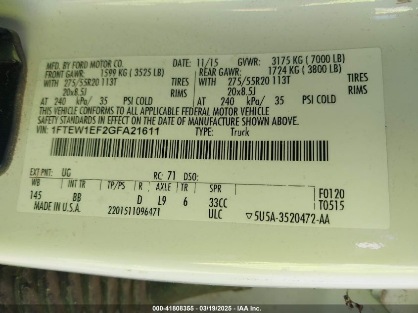 Color WhiteCylinders 8Drive Full driveVIN 1FTEW1EF2GF******State Run & Drive VerifiedDamage Back AutoRIA