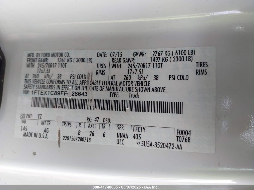 2015 FORD F-150 2015 Gasoline, 3.5, Unknown, VIN - 1FTEX1C89FF****** from the USA