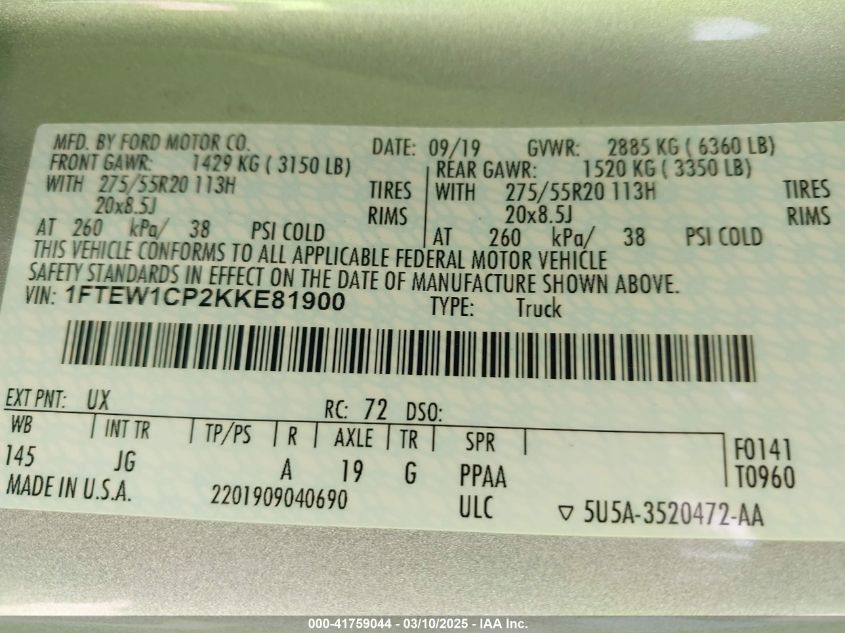 2019 FORD F-150 2019 Gasoline, 2.7, Unknown, VIN - 1FTEW1CP2KK****** from the USA