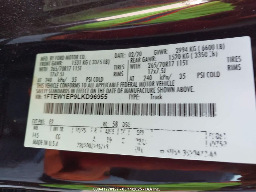 2020 FORD F-150 2020 Gasoline, 2.7, Full drive, VIN - 1FTEW1EP9LK****** from the USA