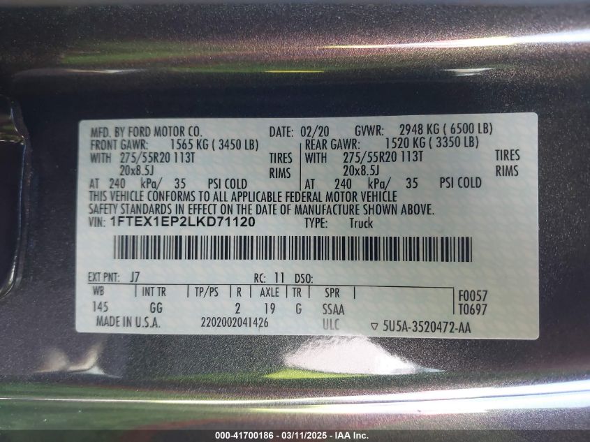 2020 FORD F-150 2020 Gasoline, 2.7, Full drive, VIN - 1FTEX1EP2LK****** from the USA