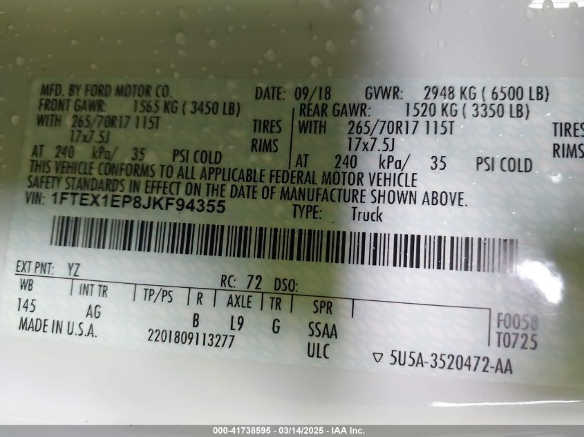 Color WhiteCylinders 6Drive Full driveVIN 1FTEX1EP8JK******State Run & Drive VerifiedDamage Front and back AutoRIA