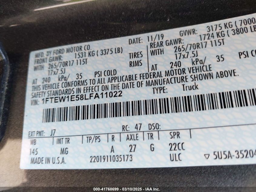2020 FORD F-150 2020 Gasoline, 5.0, Full drive, VIN - 1FTEW1E58LF****** from the USA