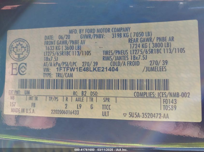 2020 FORD F-150 2020 Gasoline, 3.5, Full drive, VIN - 1FTFW1E48LK****** from the USA