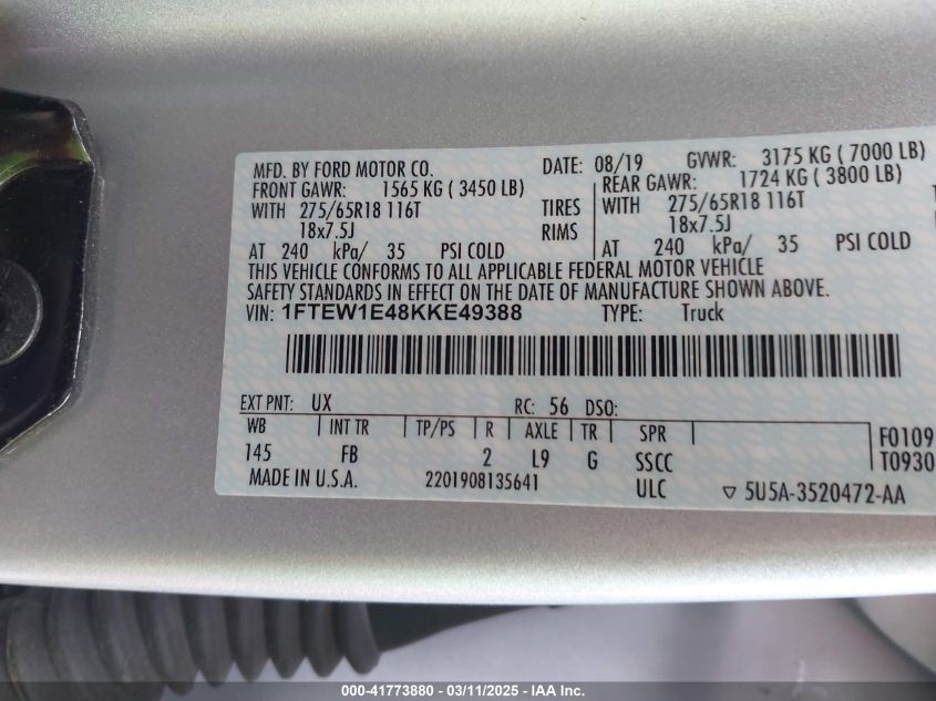 2019 FORD F-150 2019 Gasoline, 3.5, Full drive, VIN - 1FTEW1E48KK****** from the USA
