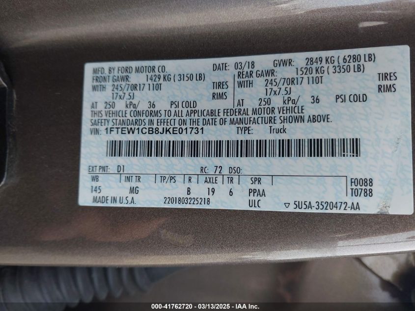 Color GrayCylinders 6Drive UnknownVIN 1FTEW1CB8JK******State Run & Drive VerifiedDamage Back AutoRIA