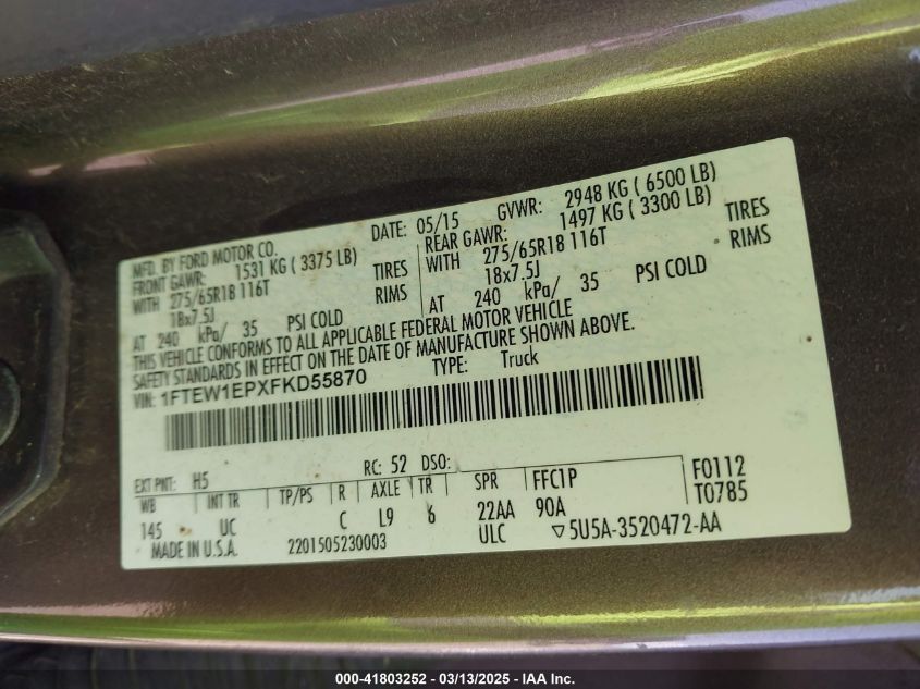 Color BrownCylinders 6Drive Full driveVIN 1FTEW1EPXFK******State Run & Drive VerifiedDamage Front or backAuction date 2025-03-27 AutoRIA