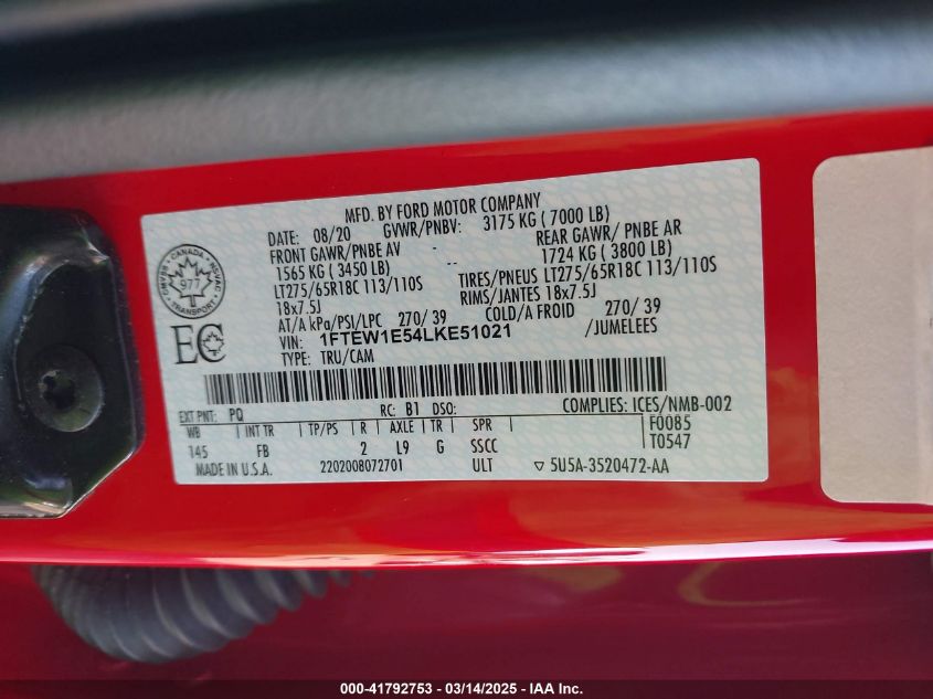 2020 FORD F-150 2020 Gasoline, 5.0, Full drive, VIN - 1FTEW1E54LK****** from the USA