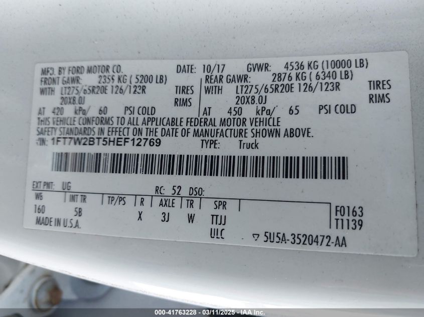 Color WhiteCylinders 8Drive Full driveVIN 1FT7W2BT5HE******State Run & Drive VerifiedDamage Due to bad weather