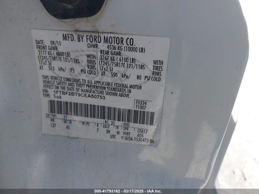 Color WhiteCylinders 8Drive Full driveVIN 1FTBF2BT9CE******State Run & Drive VerifiedDamage Back