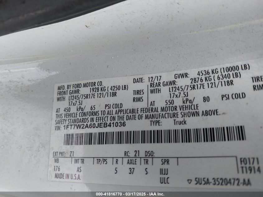 Color WhiteCylinders 8Drive UnknownVIN 1FT7W2A60JE******State Run & Drive VerifiedDamage Bio/Chemical