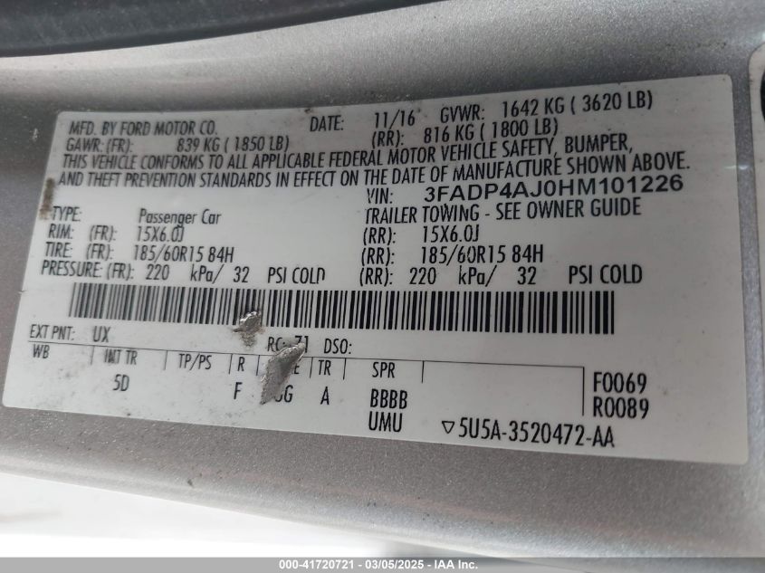 Color SilverCylinders 4Drive Front wheel driveVIN 3FADP4AJ0HM******State Run & Drive VerifiedDamage Front or back AutoRIA