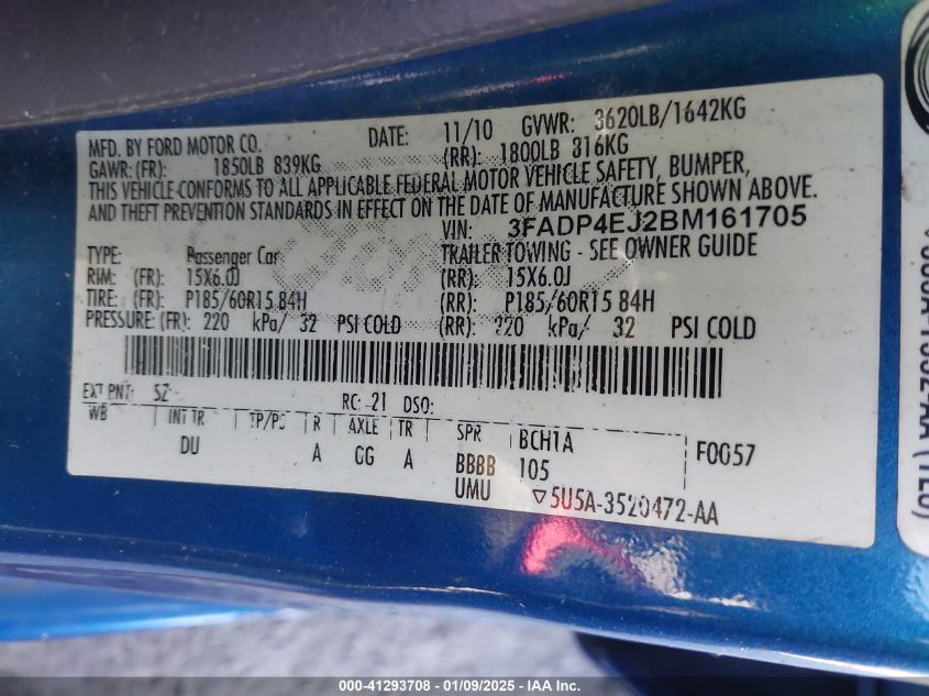 Color BlueCylinders 4Drive Front wheel driveVIN 3FADP4EJ2BM******State Run & Drive VerifiedDamage Left side AutoRIA