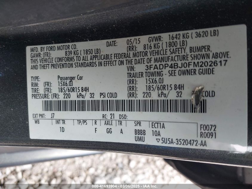 Color GrayCylinders 4Drive Front wheel driveVIN 3FADP4BJ0FM******State Run & Drive VerifiedDamage Front or backAuction date 2025-03-24 AutoRIA