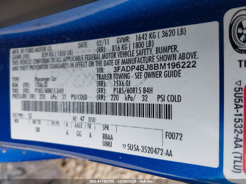 Color BlueCylinders 4Drive Front wheel driveVIN 3FADP4BJ8BM******State Run & Drive VerifiedDamage Front or backAuction date 2025-03-25 AutoRIA