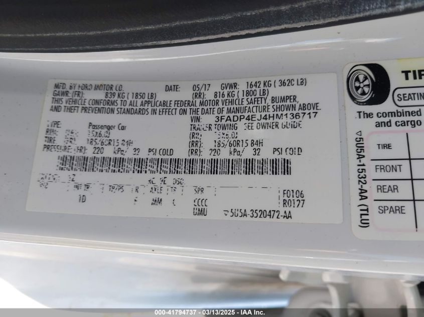 Color WhiteCylinders 4Drive Front wheel driveVIN 3FADP4EJ4HM******State Run & Drive VerifiedDamage Rear right AutoRIA