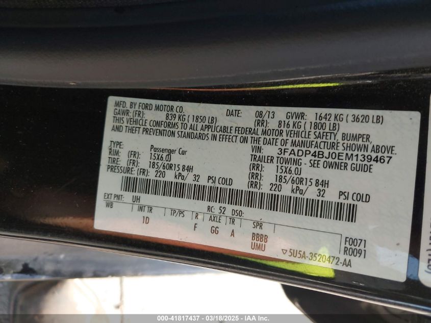 Color BlackCylinders 4Drive Front wheel driveVIN 3FADP4BJ0EM******State Run & Drive VerifiedDamage Front right AutoRIA