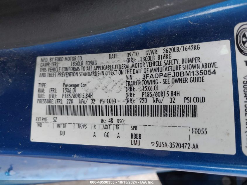 Color BlueCylinders 4Drive Front wheel driveVIN 3FADP4EJ0BM******State Run & Drive VerifiedDamage Front right AutoRIA