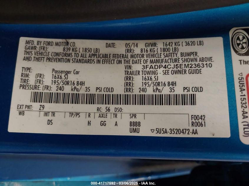 Color BlueCylinders 4Drive Front wheel driveVIN 3FADP4CJ5EM******State Run & Drive VerifiedDamage Front or back AutoRIA