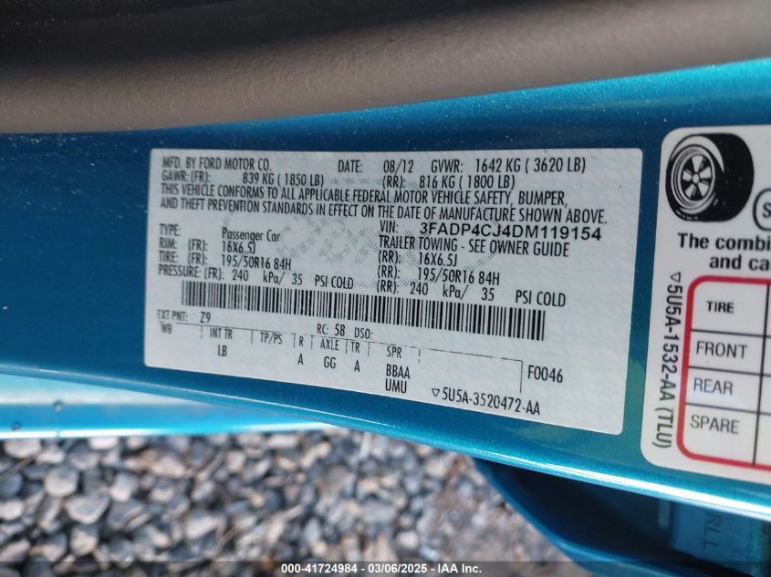 Color GreenCylinders 4Drive Front wheel driveVIN 3FADP4CJ4DM******State Run & Drive VerifiedDamage Right side AutoRIA
