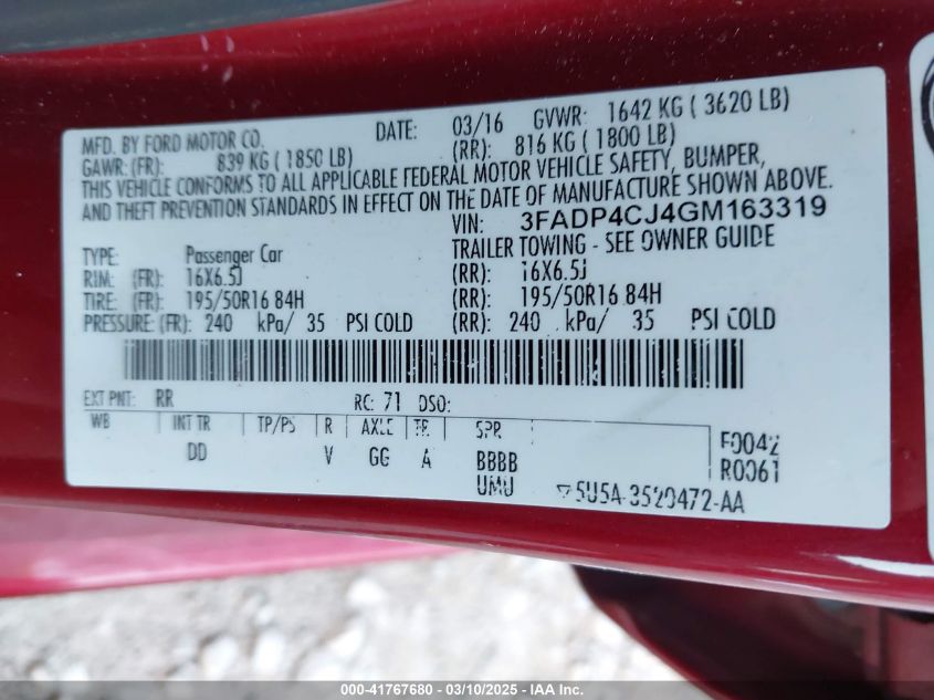 Color RedCylinders 4Drive Front wheel driveVIN 3FADP4CJ4GM******State Run & Drive VerifiedDamage InsignificantAuction date 2025-03-24 AutoRIA