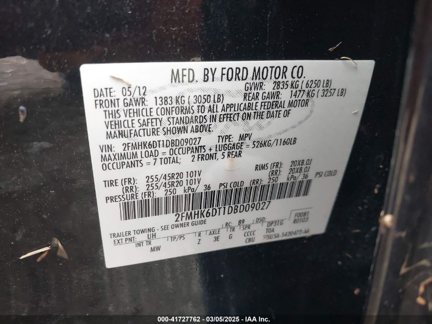 Color BlackCylinders 6Drive Full driveVIN 2FMHK6DT1DB******State Run & Drive VerifiedDamage It is unknown AutoRIA