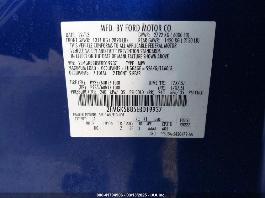 Color BlueCylinders 6Drive Front wheel driveVIN 2FMGK5B85EB******State Run & Drive VerifiedDamage Front or back AutoRIA