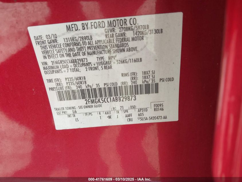 Color RedCylinders 6Drive Front wheel driveVIN 2FMGK5CC1AB******State Run & Drive VerifiedDamage Front or backAuction date 2025-03-26