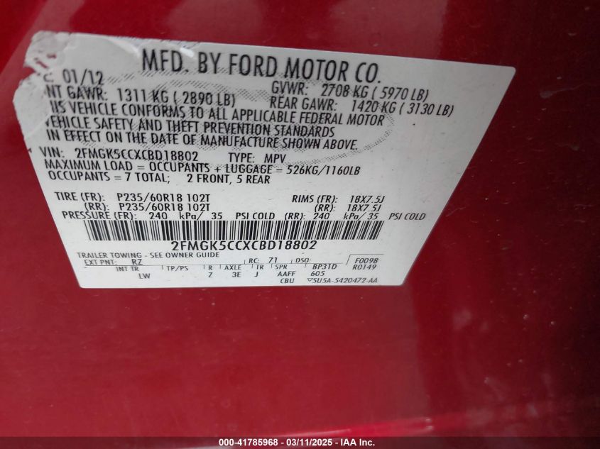 Color RedCylinders 6Drive Front wheel driveVIN 2FMGK5CCXCB******State Run & Drive VerifiedDamage Front or backAuction date 2025-03-21 AutoRIA