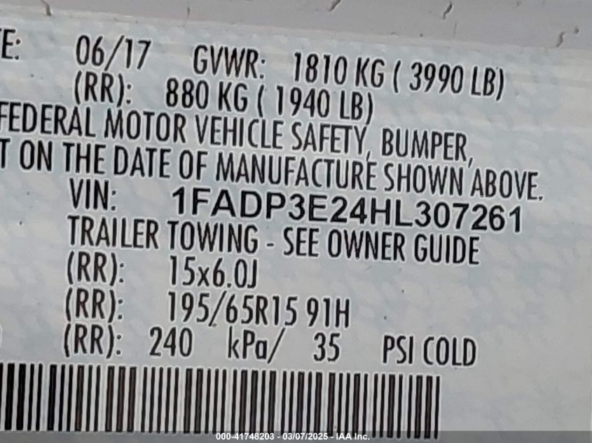 Color WhiteCylinders 4Drive Front wheel driveVIN 1FADP3E24HL******State Run & Drive VerifiedDamage Front or back AutoRIA
